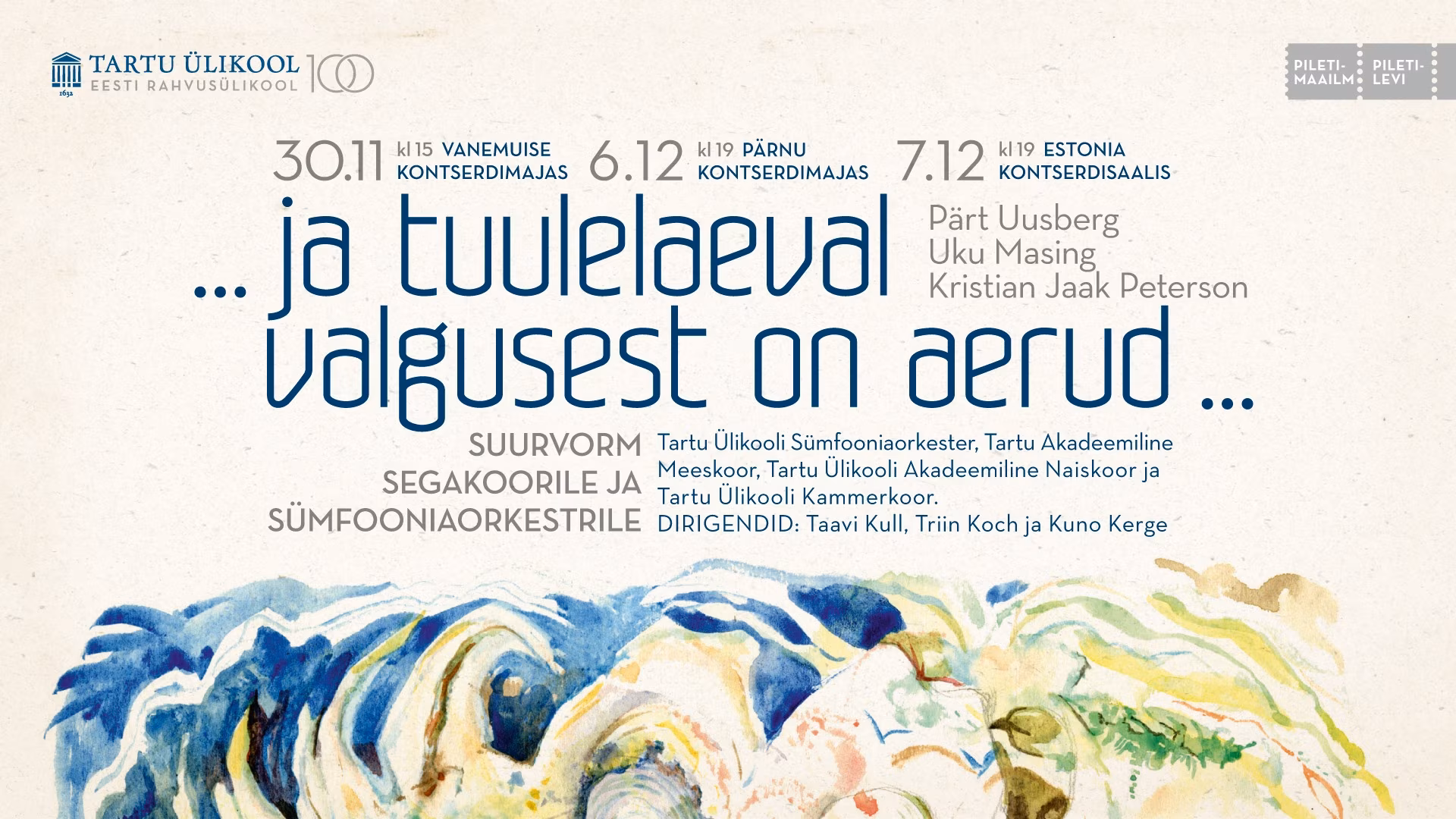 Emakeelse Tartu ülikooli 100. aastapäeva oluliseks tähiseks sai 30. novembril Vanemuise kontserdimajas esiettekandele tulnud Pärt Uusbergi seni suurim helitöö, 40 minutit kestev pühendusteos “… ja tuulelaeval valgusest on aerud …”. Suurvormi tellis Tartu ülikool, selle esitasid TÜ akadeemiline naiskoor, TÜ kammerkoor, Tartu akadeemiline meeskoor ja TÜ sümfooniaorkester, dirigeeris Taavi Kull.