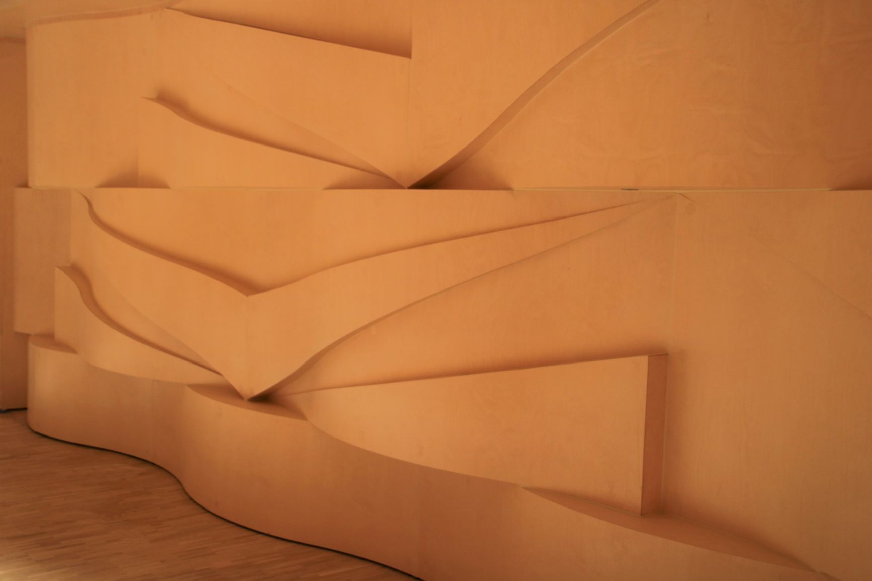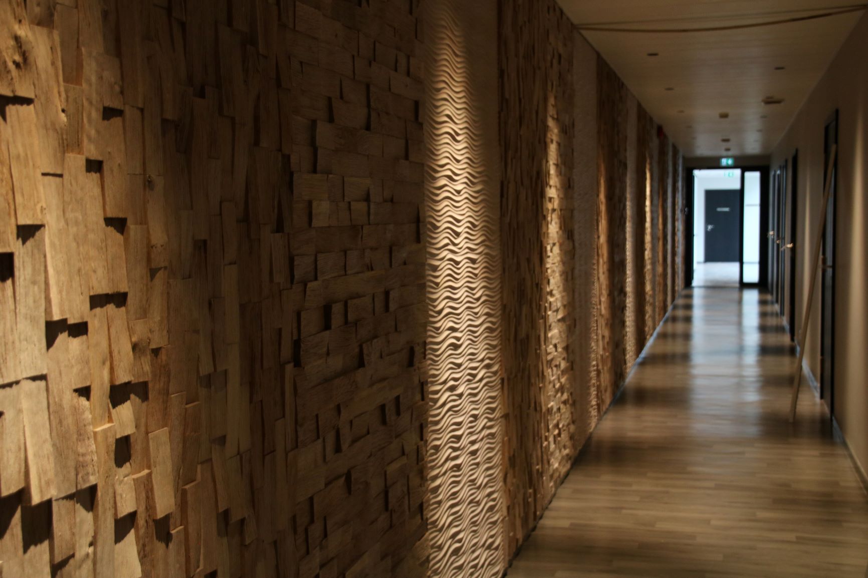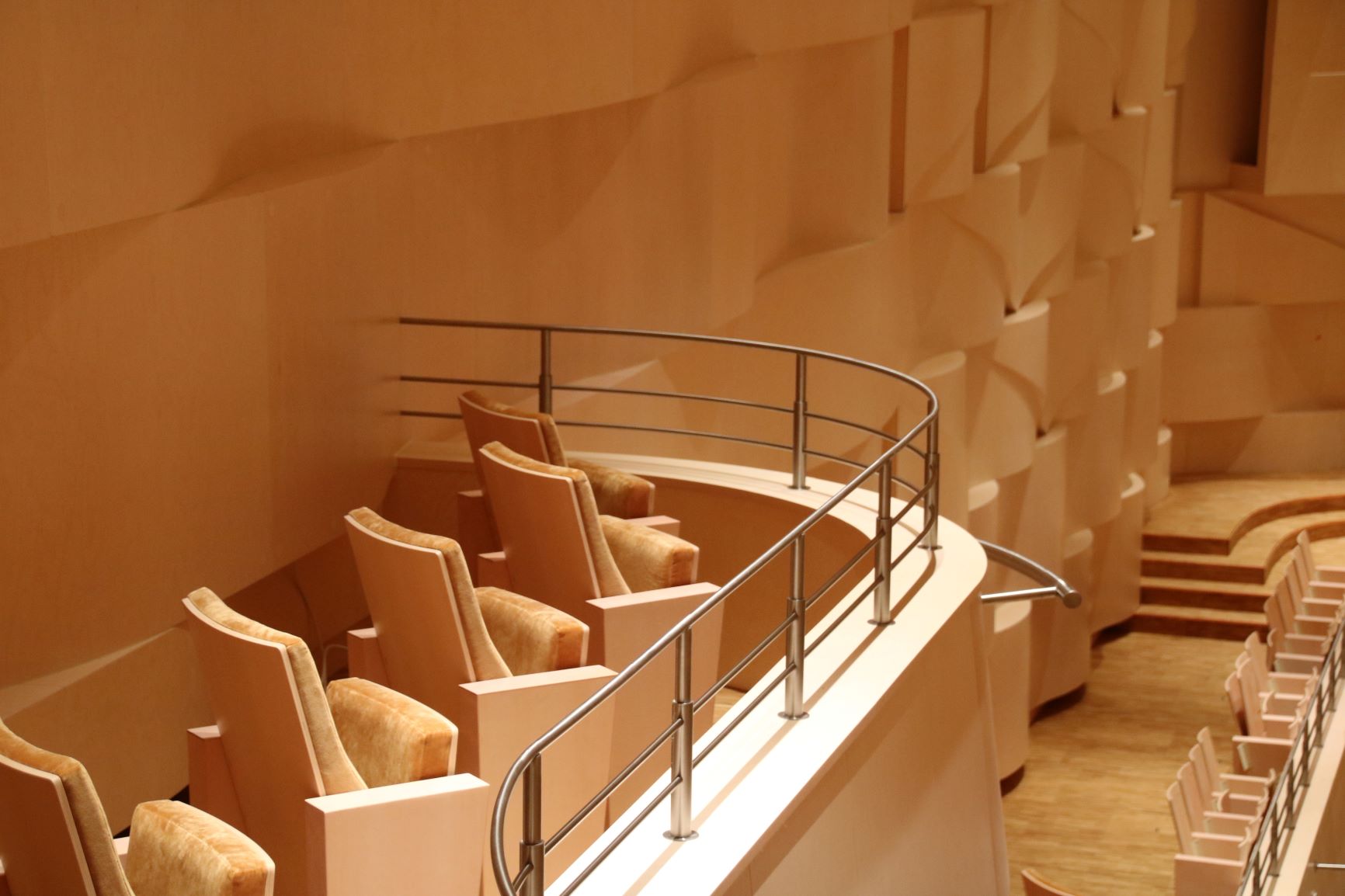 Mu soov oli kujundada saali võimalikult heledates toonides, selletõttu valisin sisekujunduse põhimaterjaliks heleda kasepuidu. Minu põhimõte oli puitu kasutada naturaalselt, et säiliks selle loomulik soe värv ja tekstuur. Kõik kasevineerist laineelemendid on tehtud Eesti tislerifirmas, vormidega pressitud. See oli keerukas ja aeganõudev käsitöö, aga tulemus on ilus ja unikaalne. Võib öelda, et Eesti sai endale maailmas ainulaadse modelleeringuga saali.
