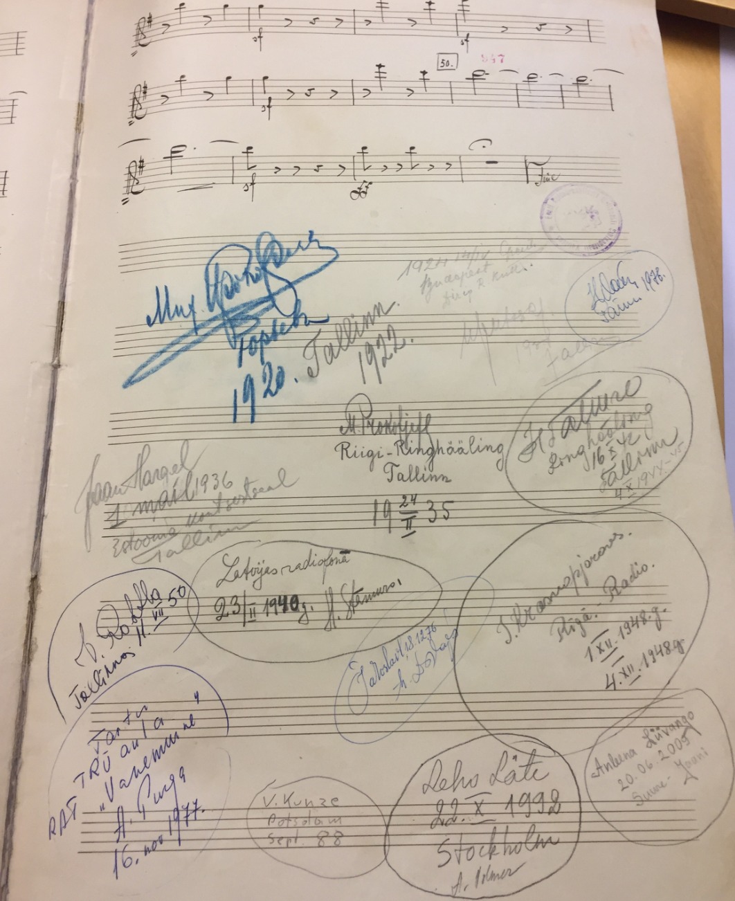 Muuseumi valduses on praegu nii teise versiooni käsikirjaline originaalpartituur kui ka selle käsikirjaline ümberkirjutus. Originaalis on vene keeles iga osa lõppu märgitud valmimise kuupäev: I osa on lõpetatud 12. juulil, II osa 15. juulil ning III osa 20. juulil 1910. aastal. (ETMM M160:2/32) Käsikirjaline koopia oli kuni 2013. aastani ERSO noodikogus, mil see anti üle muusikamuuseumile. (ETMM M160:2/132). Kui orkestripartiidest leiab esituste kohta orkestriantide märkmeid, siis partituuri koopiasse on 1976. aastast hakanud sissekandeid tegema ka dirigendid; nii esimene kui viimane märge on Neeme Järvilt. Käsikirjalised orkestripartiid on endiselt ERSO noodikogus ning on üllataval kombel väga hästi säilinud. Rein Mälksoo on veendunud, et need on pärit aastast 1910. Seega on selle teose noodimaterjal palju väärtuslikum kui lihtsalt noot, sisaldades endas omamoodi muusikalist reisipäevikut.